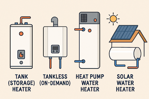 - There are several types of water heaters, each supporting different needs and usage levels.