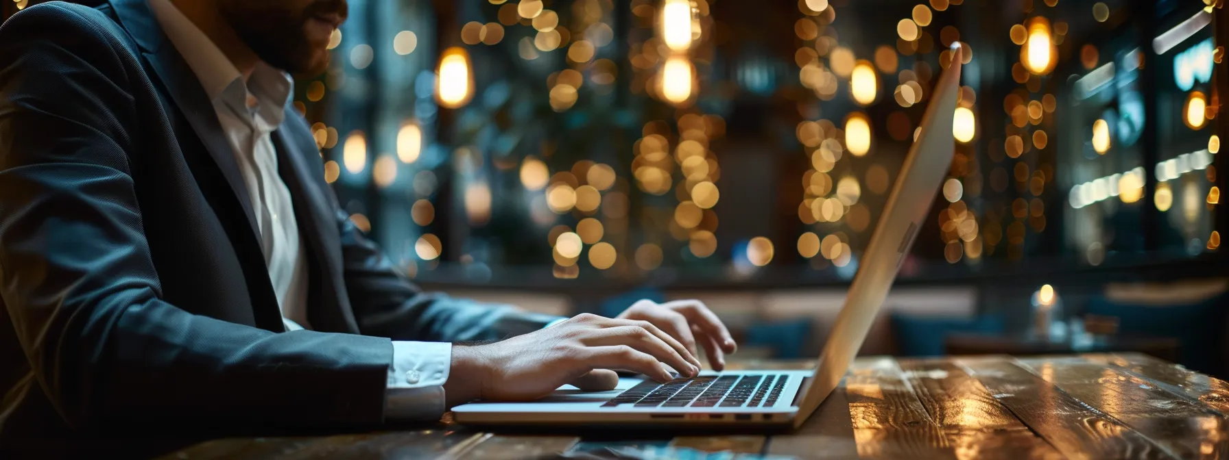 a businessman typing on a laptop with a screen showing an advanced search interface powered by sharepoint online and ba insight's connector.