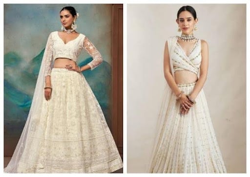 Not pure stark white, but white-with-tones: ivory, champagne, pearl-white can never lessen the spark. These slight shifts deserve to be your next purchase when you explore the unique Indian Lehenga sets for women.
