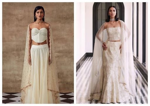 Corset lehenga design is another long-lived design, loved by many. Traditional cholis are being replaced by structured blouses and asymmetrical cuts that give a contemporary edge to the white lehenga for women.