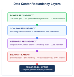 When power fails in an on-premises server room, it’s a race against time. UPS batteries last an hour—maybe two. Or not even that. A diesel generator? Only if you have one, and if it works. In a professional data center, this kind of drama doesn’t exist—redundancy isn’t a luxury; it’s the standard. Every critical system is implemented at least twice, and often more.